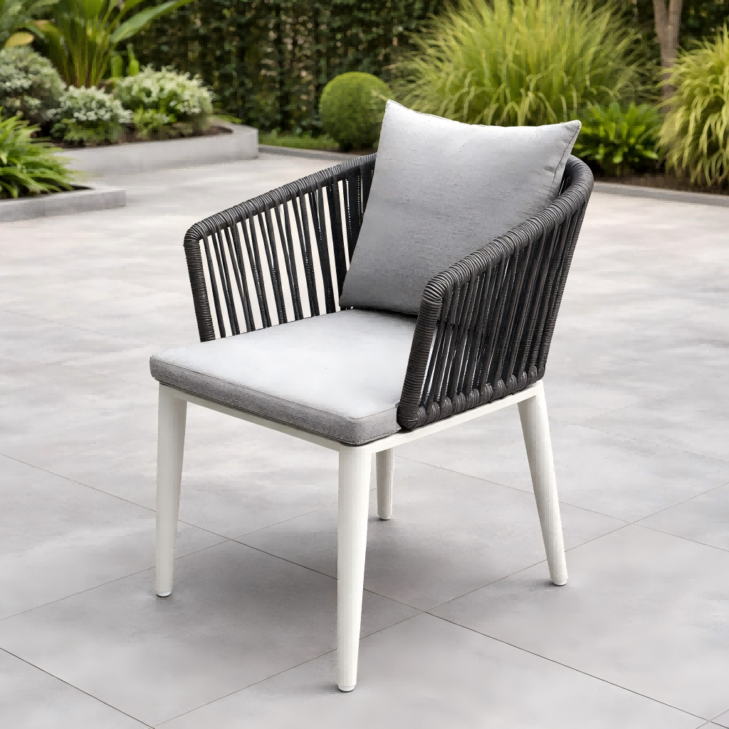 Matstolarna har ett repvävt ryggstöd, vilket skapar ett modernt och elegant utseende samtidigt som de ger ett bekvämt stöd. Ramen är gjord av pulverlackerad aluminium, vilket ger utmärkt motståndskraft mot rost och utomhus väderförhållanden.
