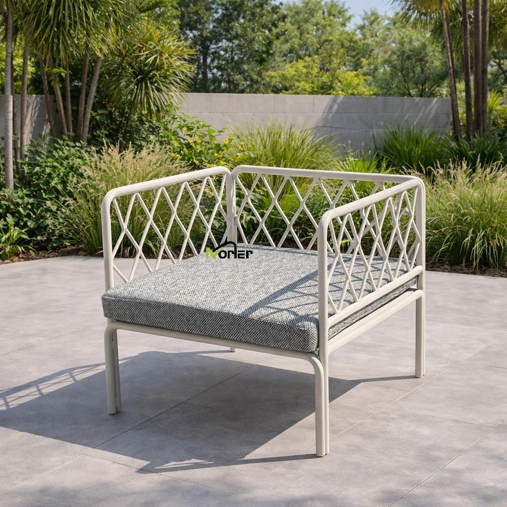 Detta moderna utomhussoffset har en ren och minimal design med en vackert utformad geometrisk metallram. Den öppna gallerstrukturen skapar ett lätt och elegant utseende samtidigt som det behåller ett starkt strukturellt stöd.