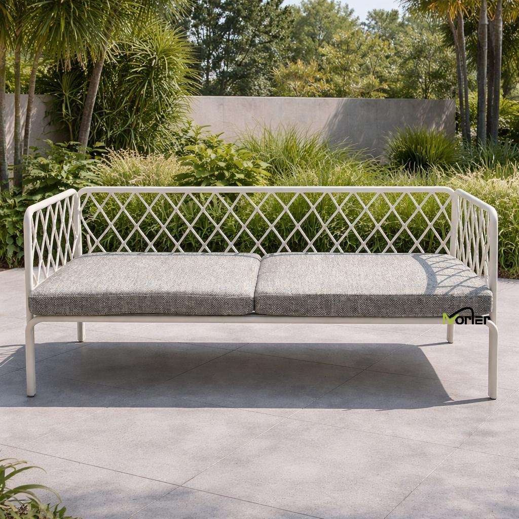 Byggd med högkvalitativ pulverlackerad aluminiumm, denna utomhussoffa är designad för att klara olika väderförhållanden samtidigt som den behåller sitt moderna utseende.